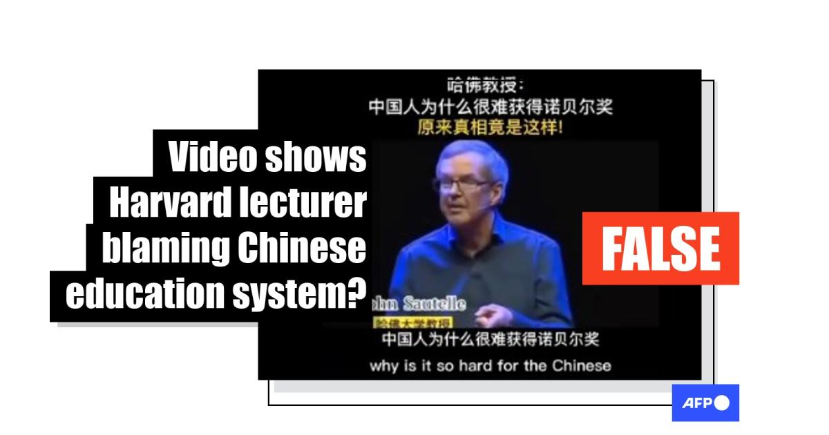 The clip shows a man introduced as John Sautelle, who appears to blame China's lack of Nobel Prizes on the country's education system.