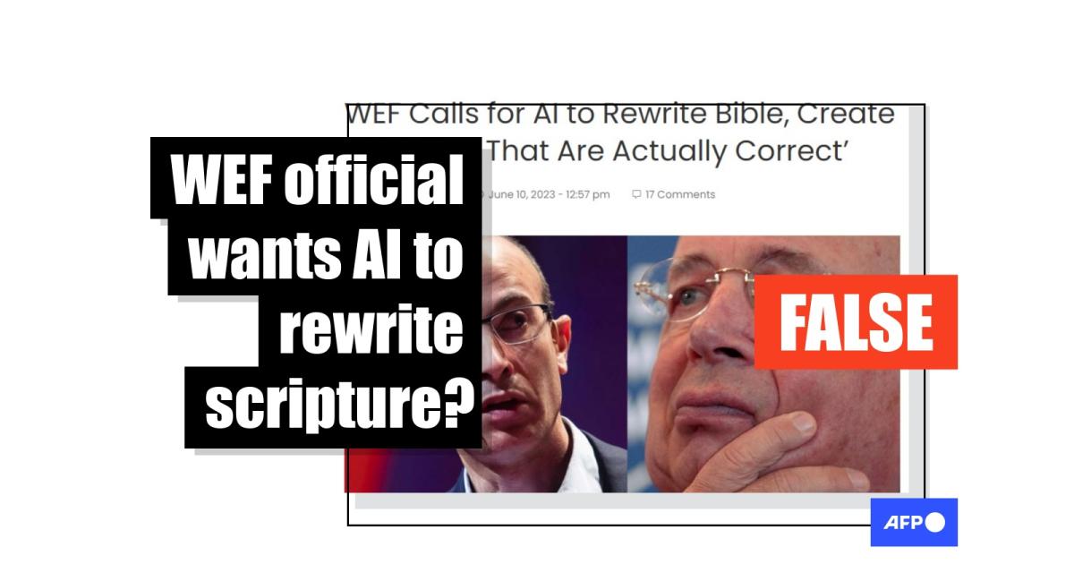"The World Economic Forum never called for AI to rewrite the Bible and never made any statements about banning the Bible or calling for a new world religion," WEF spokesperson Yann Zopf told AFP on June 28, 2023. "These are false claims to discredit the important work that the World Economic Forum does on serious global challenges."