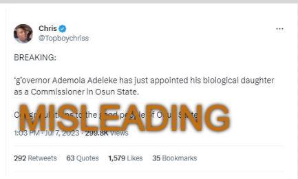 “BREAKING: 'g’overnor Ademola Adeleke has just appointed his biological daughter as a commissioner in Osun State (sic),” reads a tweet published on July 7, 2023.