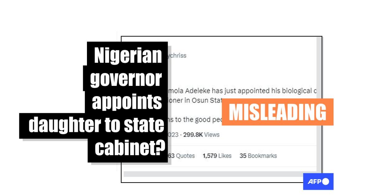 A post has been shared multiple times on social media in Nigeria with claims that the governor of Osun state, Ademola Adeleke, had appointed his daughter Adenike Adeleke to the state cabinet. Another post also claimed that the governor had appointed a second family member, Morufu Adeleke, into the state cabinet. But these claims are misleading: Adeleke did not appoint his daughter but rather the wife of his deceased brother; the two women share the same name. Meanwhile, there is no evidence that Morufu Adeleke is related to the governor, a claim both he and the state government denied.