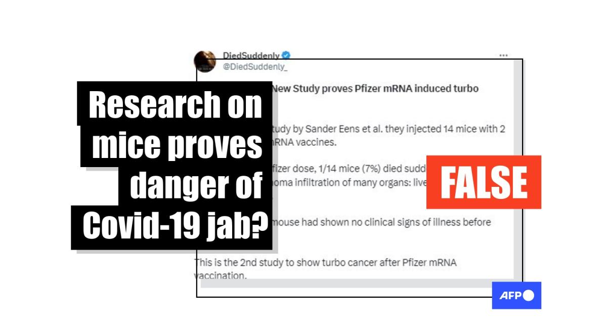 "In a new Belgian study by Sander Eens et al. they injected 14 mice with 2 Pfizer COVID-19 mRNA vaccines. 2 days after 2nd Pfizer dose, 1/14 mice (7%) died suddenly, had turbo cancer with lymphoma infiltration of many organs: liver, kidneys, spleen, lungs & intestines," claims a July 7, 2023 tweet from an account linked to the widely debunked film "Died Suddenly."