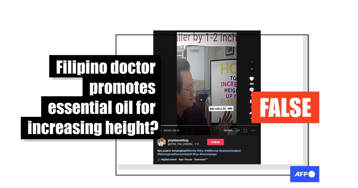 Karissa Genuino-Regalado, an orthopaedic surgeon in Manila, told AFP that essential oils, like the product advertised in the false post, cannot help someone grow taller (archived link).