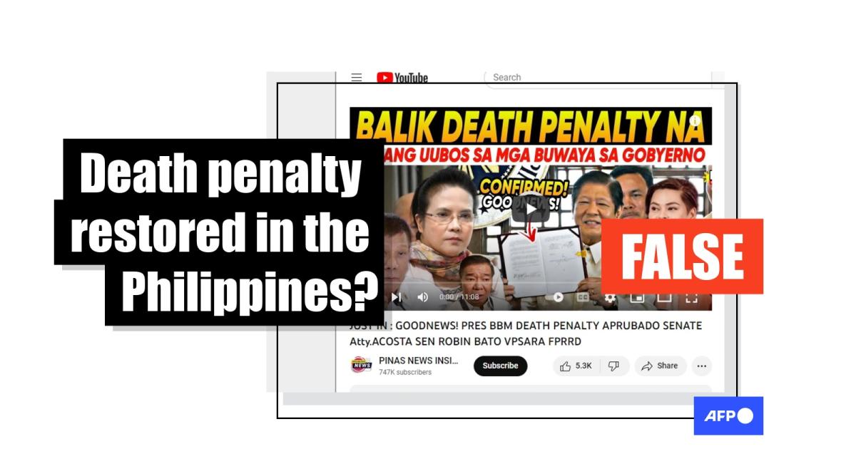 "Death penalty is back. This will eliminate all the greedy ones in government," reads the Tagalog-language text on the thumbnail of a YouTube video that has been viewed more than 100,000 times since it was posted on July 30, 2023.