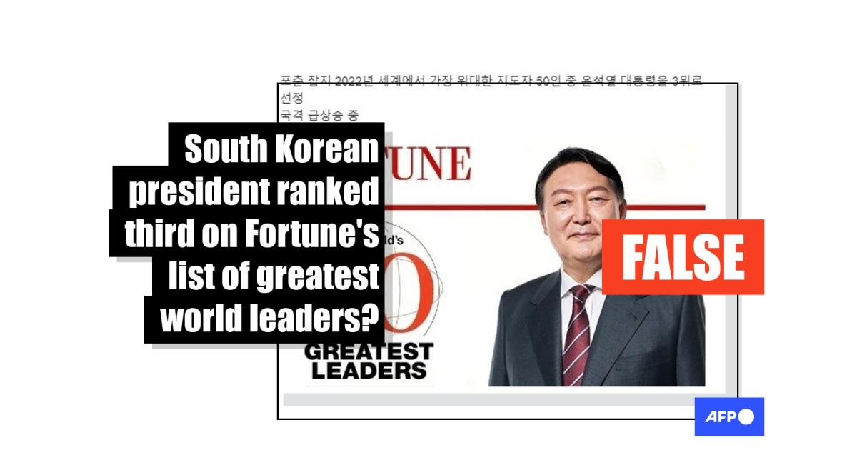 "Fortune Magazine selected President Yoon Suk Yeol as number three on its list of the World's 50 Greatest Leaders in 2022," reads the Korean-language claim shared here on South Korean social media platform Naver Band on August 2, 2023.