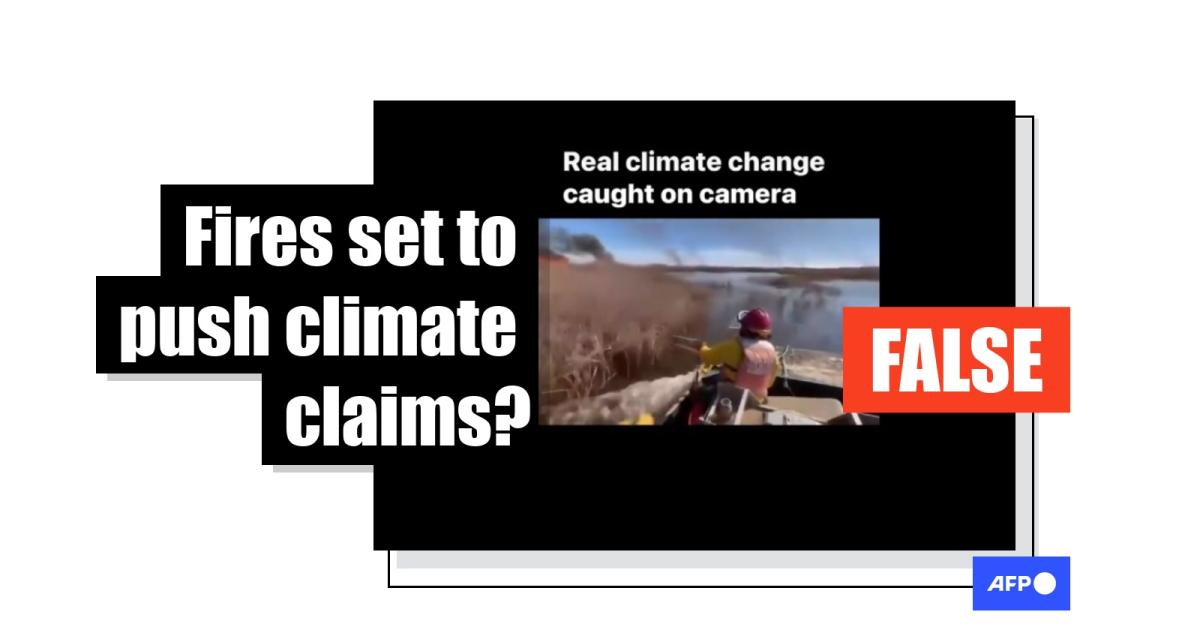 "Real climate change caught on camera," says text over an August 21, 2023 Facebook reel that shows an airboat zipping through a wetland as a man uses a torch to shoot fire into the brush.