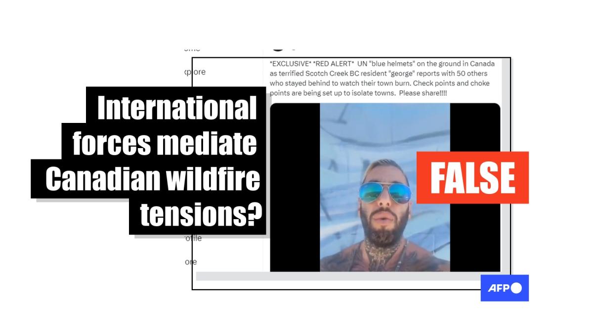 In the video, Saccoccia -- whom AFP has previously fact-checked for spreading misinformation -- claims he received a picture of UN peacekeepers in Scotch Creek, British Columbia. The community on Shuswap Lake in the southeast of the province has recently faced wildfire threats and tensions over evacuation orders.