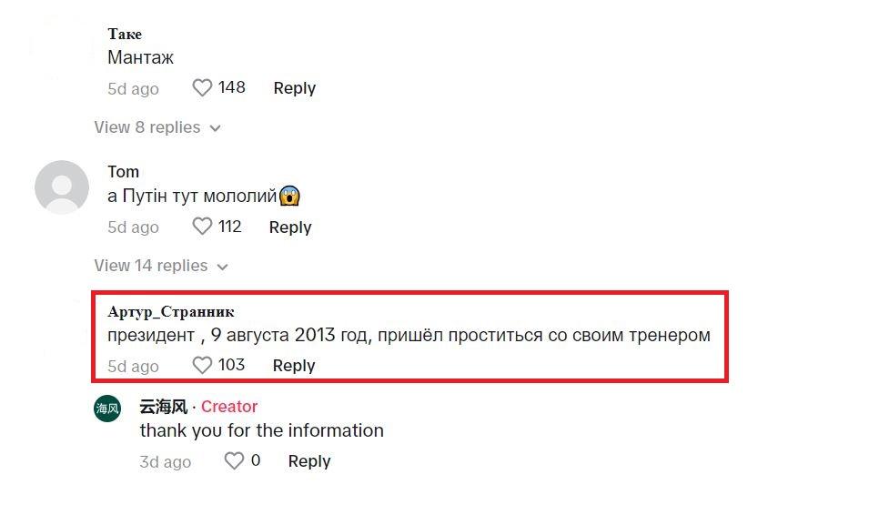 One of the people commenting on the TikTok video in Russian says that Putin was bidding goodbye to his coach on August 3, 2013.