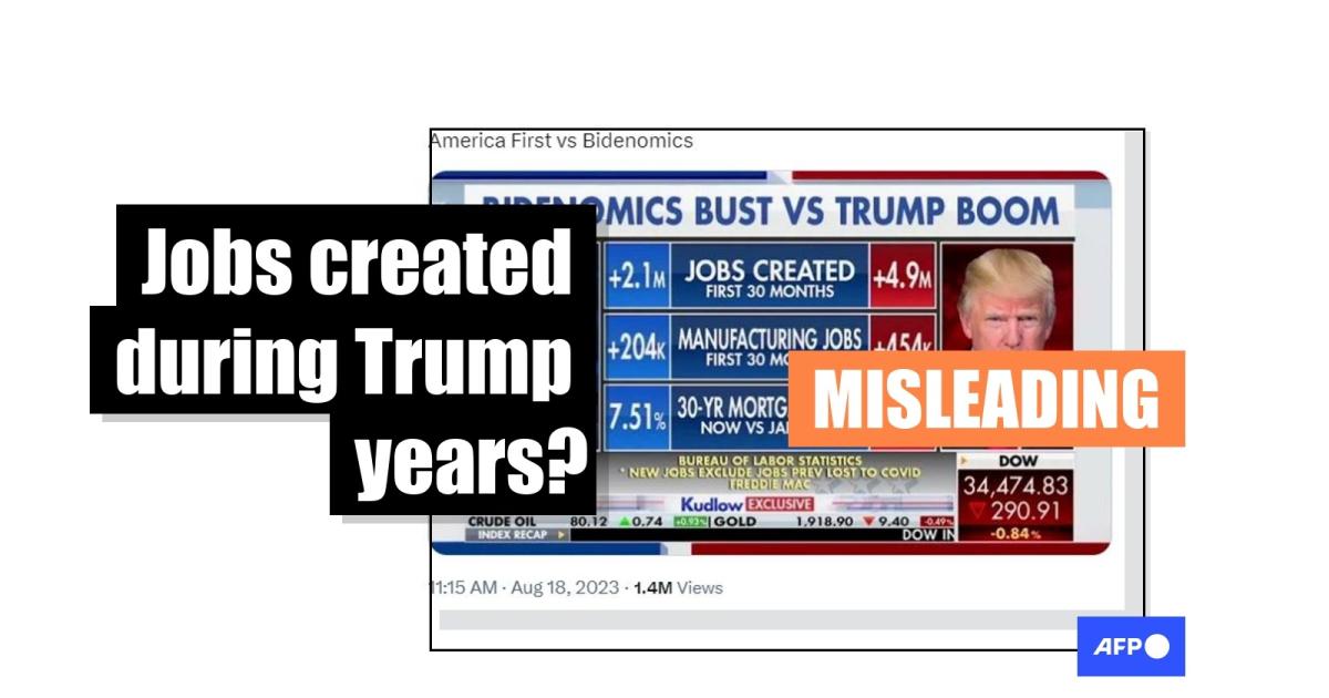 A screenshot from Fox News shared by Donald Trump Jr., the former president's son, on August 18, 2023 on X, and by Daniel Scavino, the social media director in the Trump White House, on Facebook, on September 14 makes the assertion that 4.9 million jobs were created in the first two and a half years of Trump's Republican administration, compared with 2.1 million in the same period under Biden.