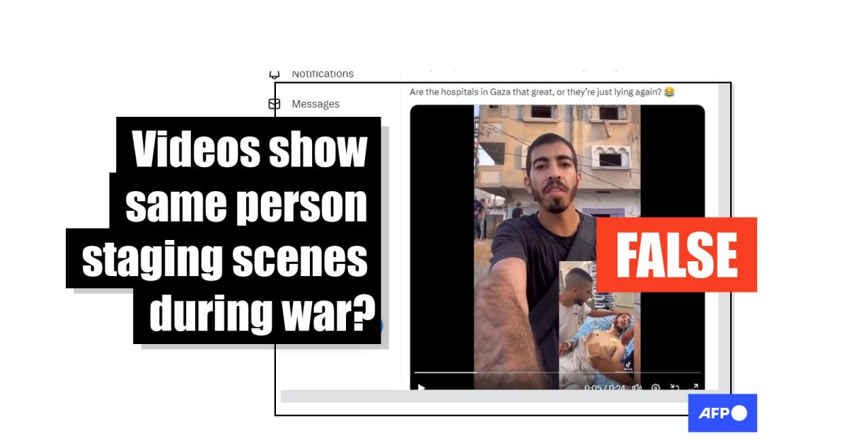 One of the recordings appears to show a man walking through the rubble in Gaza, speaking of the effects of Israeli bombardments -- which have left thousands injured -- while the other shows a man being comforted as he lies in a hospital bed, attached to machines monitoring his vitals. The two clips are claimed to show the same person and posts say his impossibly fast recovery proves he was faking his injuries and staging content about the ongoing Israel-Hamas war.