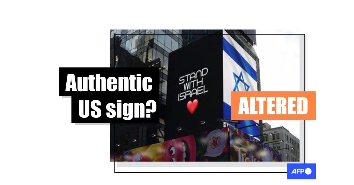 AFP geolocated the billboards to the corner of West 50th Street and 7th Avenue, based on the surrounding buildings and businesses near Times Square, including the cafe Majestic Delicatessen (archived here).