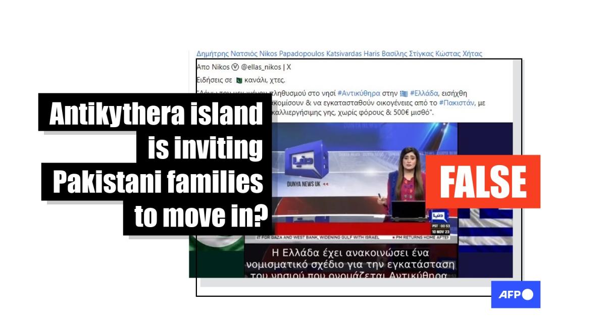 The Greek City Times has a separate article entitled: "FAKE NEWS ALERT: The report inviting Pakistanis to live in Antikythera for €500 a month is NOT true!". It was published in November 2023, days after the Pakistan news bulletin cited on social media.