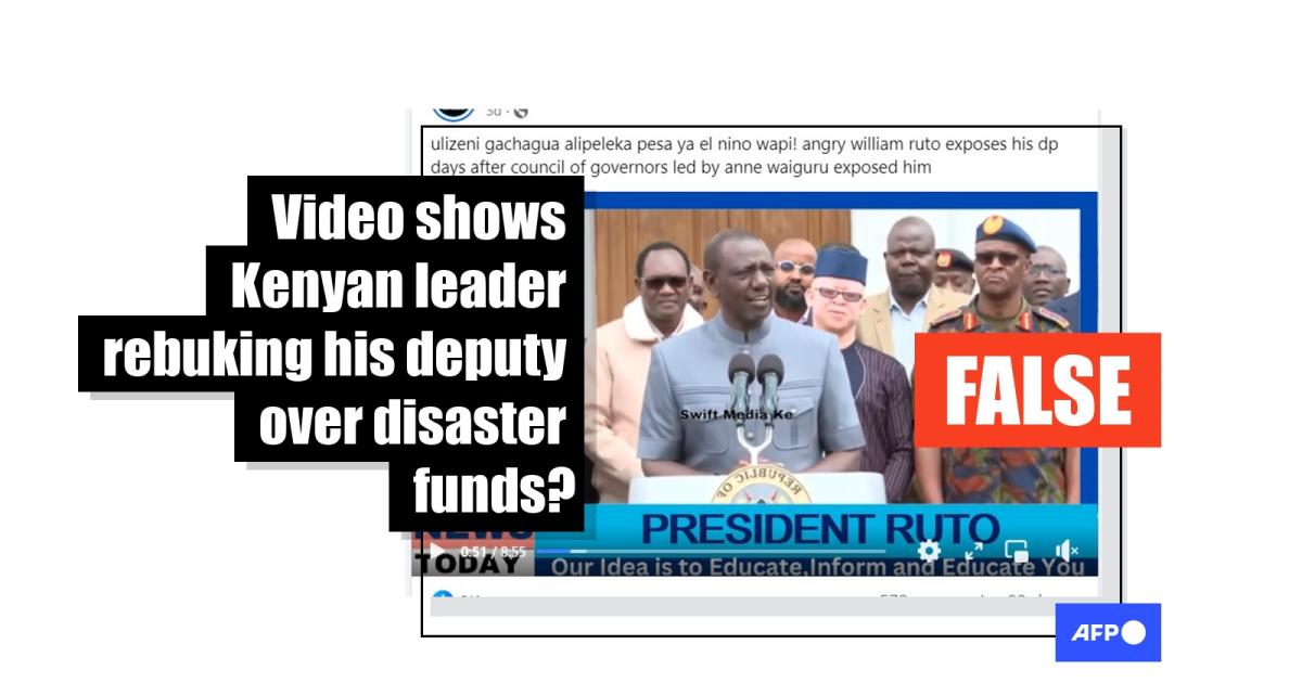 AFP Fact Check watched the entire video shared on social media, which is eight minutes and 55 seconds long. At no point in this footage does Ruto chide Gachagua over emergency response funds, as claimed.