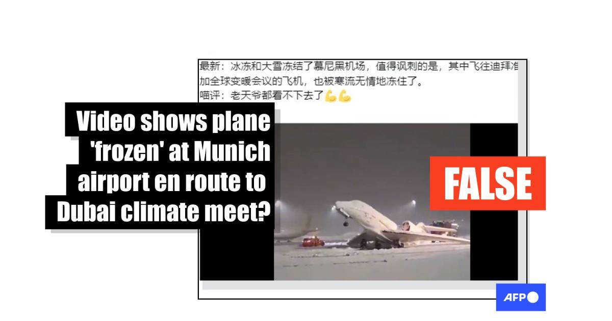 "Latest: Ice and snow has frozen the Munich airport, ironically, a plane flying to Dubai for the global warming conference has also been cruelly frozen by the cold front," reads a simplified Chinese post on X on December 3, 2023.
