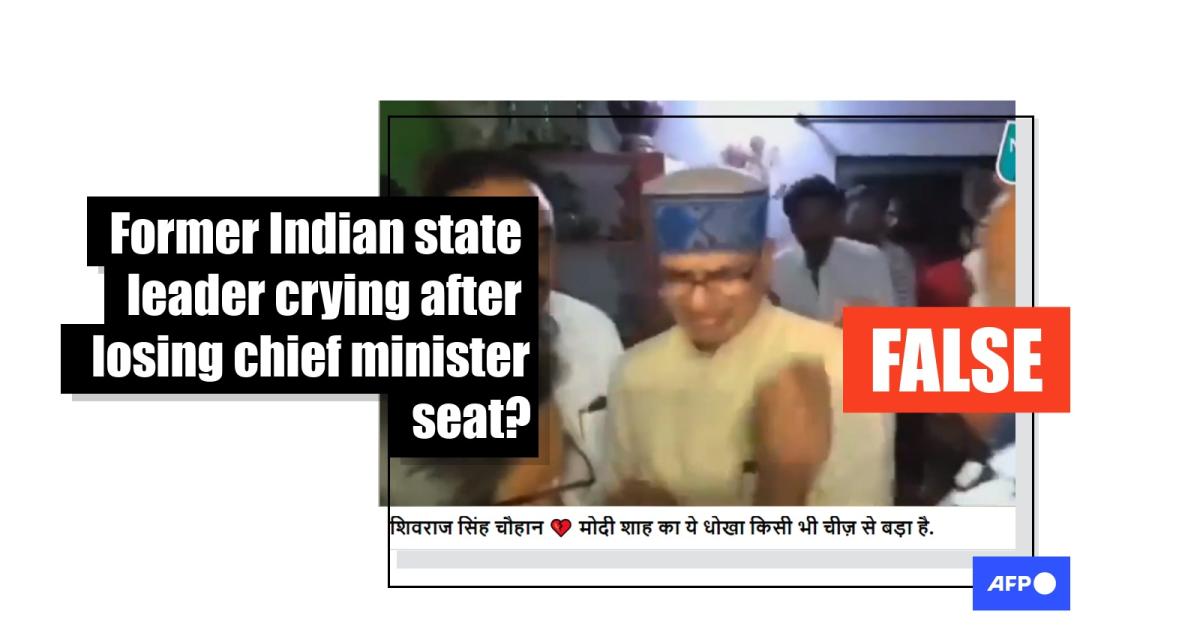 The 14-second video shows Shivraj Singh Chauhan, a senior leader in the ruling Bharatiya Janata Party (BJP) and former chief minister of India's central Madhya Pradesh state, crying as he is consoled by people around him (archived link).