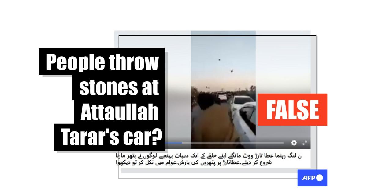 Its Urdu-language caption translates as: "People started throwing stones at Pakistan Muslim League Nawaz leader Attaullah Tarar when he reached out to his constituents in a village and asked them to vote for him."