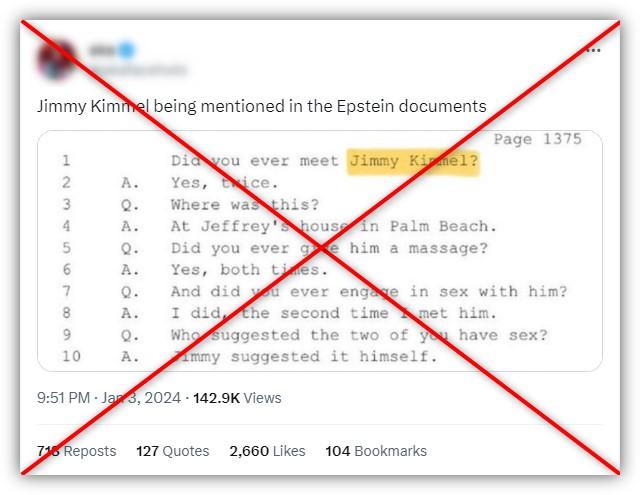 "Jimmy Kimmel being mentioned in the Epstein documents," says a January 3, 2024 post on X, formerly Twitter.