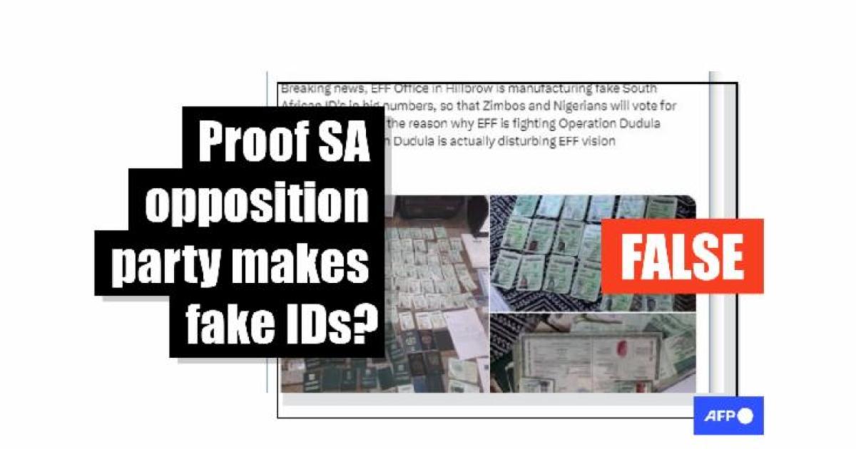 "EFF Office in Hillbrow is manufacturing fake South African ID's in big numbers, so that Zimbos and Nigerians will vote for EFF in 2024, that's the reason why EFF is fighting Operation Dudula because Operation Dudula is actually disturbing EFF vision," reads a Facebook post published on January 6, 2024.