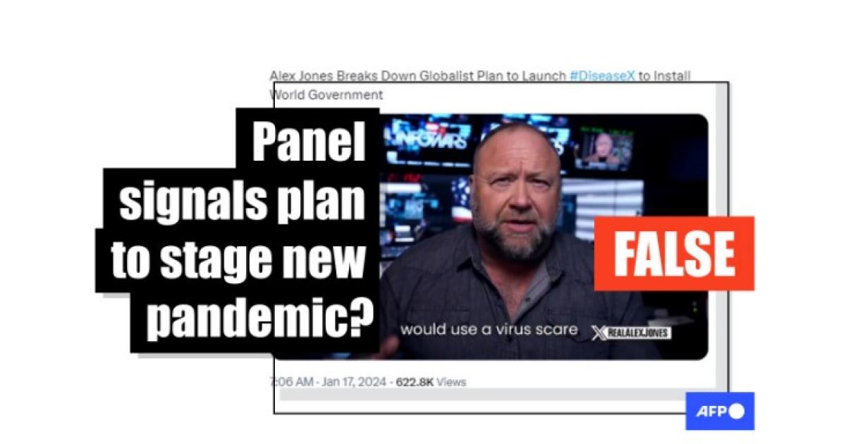 "Disease X is coming. But it isn't some chaotic pandemic we must manage. It is a genocidal kill weapon agreed upon by the worst members of humanity," says InfoWars founder Alex Jones -- who made millions by spreading conspiracy theories about mass shootings and Covid-19 -- in a January 17, 2024 post on X, formerly Twitter.