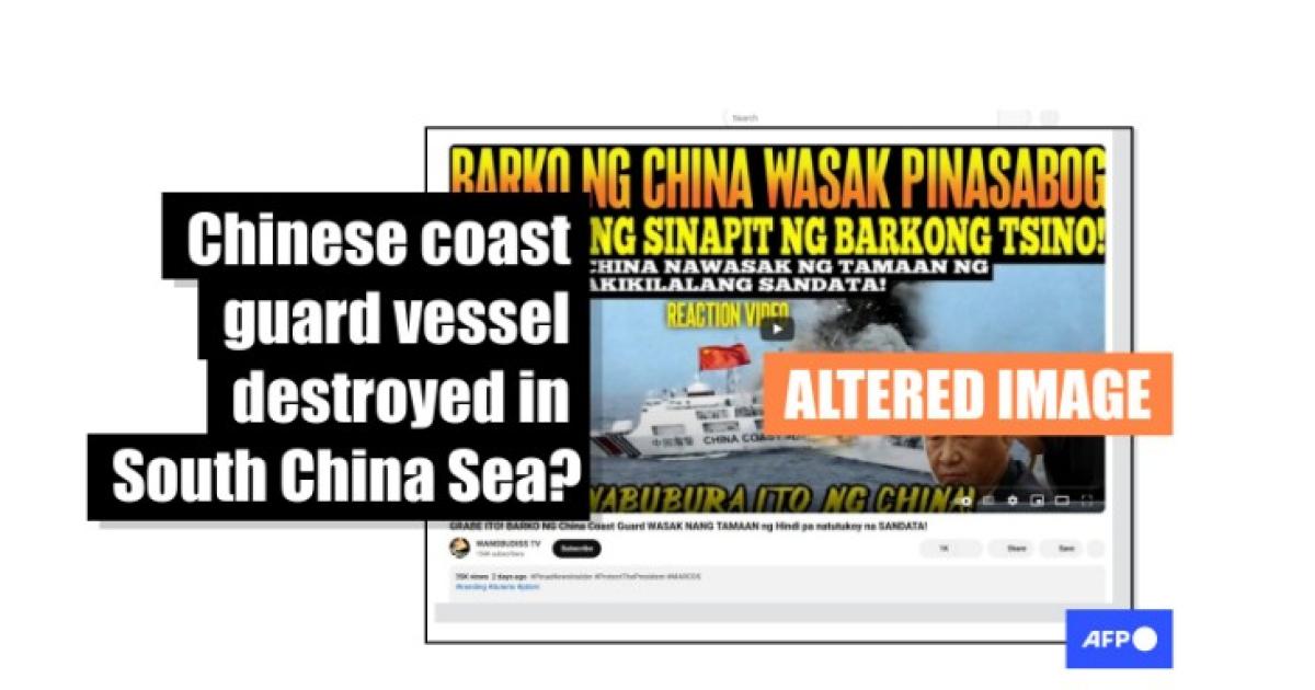 But AFP journalists in the Philippines can confirm there had been no reports of any Chinese coast guard ships destroyed in the South China Sea. The video also uses images altered from photos of coast guard vessels patrolling in disputed waters in the South China Sea and East China Sea.