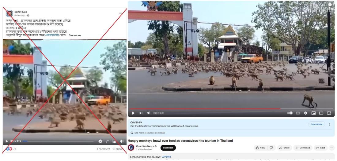 A video of a troop of monkeys brawling on a street in Thailand has been viewed thousands of times in Facebook posts that falsely claim they were heading to a contentious Hindu temple built on the ruins of a mosque in India. The video was shared online in India's neighbour Bangladesh, which is home to a Hindu minority of about 17 million people.