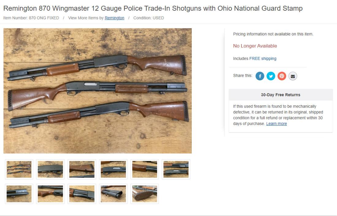 The sites identified the weapons as Remington 870 shotguns from the Ohio National Guard and sold by a shop called Sportsman’s Outdoor Superstore.