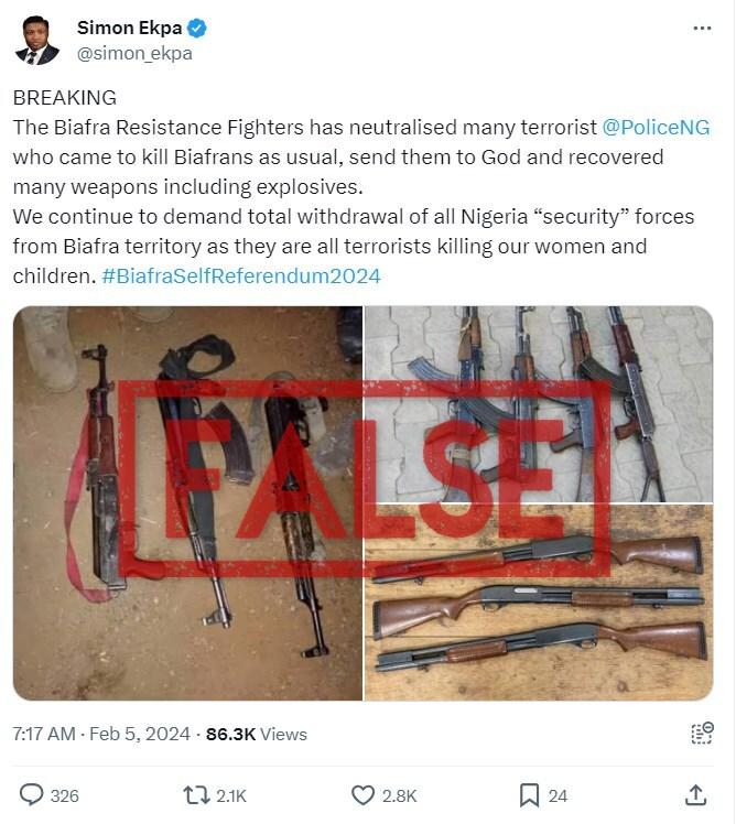 “The Biafra resistance fighters has neutralised many terrorists @PoliceNG who came to kill Biafrans as usual, send them to God and recovered many weapons including explosives (sic),” Ekpa wrote in an X post published on February 5, 2024.