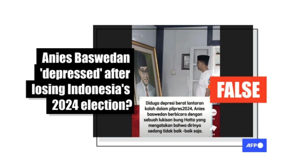 "Allegedly suffering from serious depression because he lost the 2024 presidential election, Anies Baswedan spoke with a painting of Bung Hatta and talked about how he was not doing well," reads Indonesian-language sticker text on a clip posted to SnackVideo on February 22, 2024.