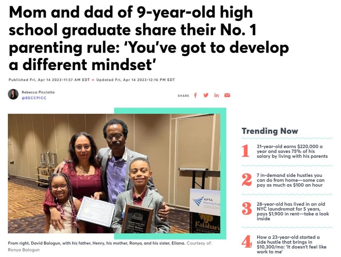 CNBC reported at the time that the boy, identified as David Balogun, had already finished a semester at Bucks County Community College in Pennsylvania. He was pictured with his parents and sister.