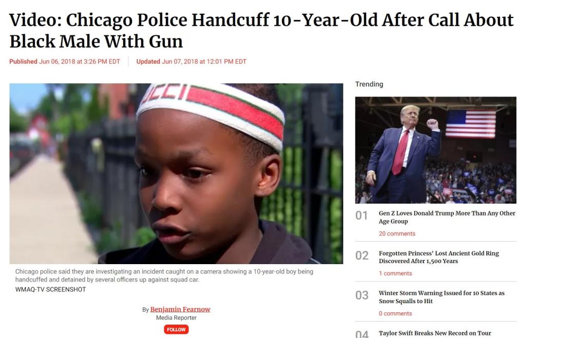 The report identified him as 10-year-old Michael Thomas Jr, who was arrested and handcuffed by police officers in Chicago (archived here). The arresting officers were found to have violated policy by restraining the boy for “an extended period of time”.