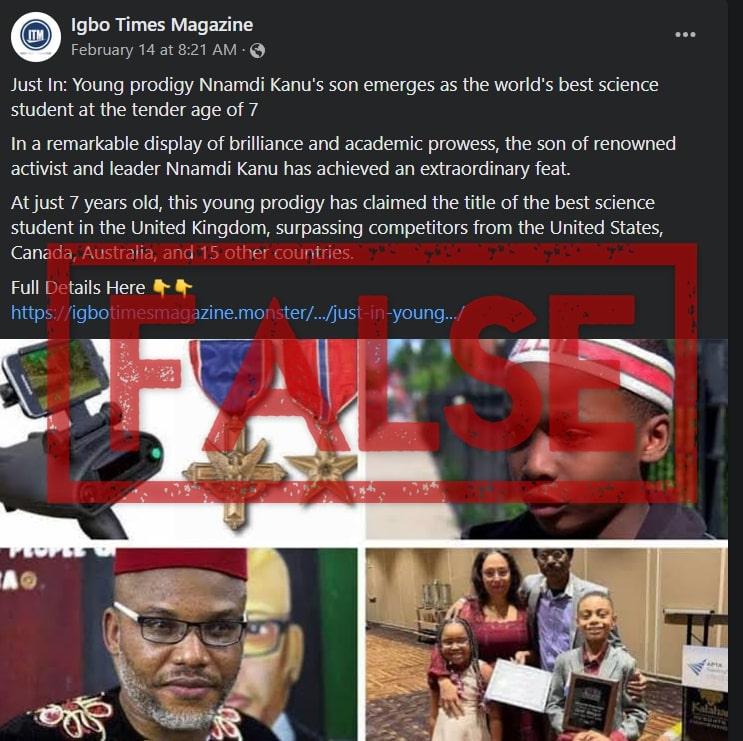 “In a remarkable display of brilliance and academic prowess, the son of renowned activist and leader Nnamdi Kanu has achieved an extraordinary feat. At just 7 years old, this young prodigy has claimed the title of the best science student in the United Kingdom, surpassing competitors from the United States, Canada, Australia, and 15 other countries,” reads the post shared on Facebook by “Igbo Times Magazine” on February 14, 2024.