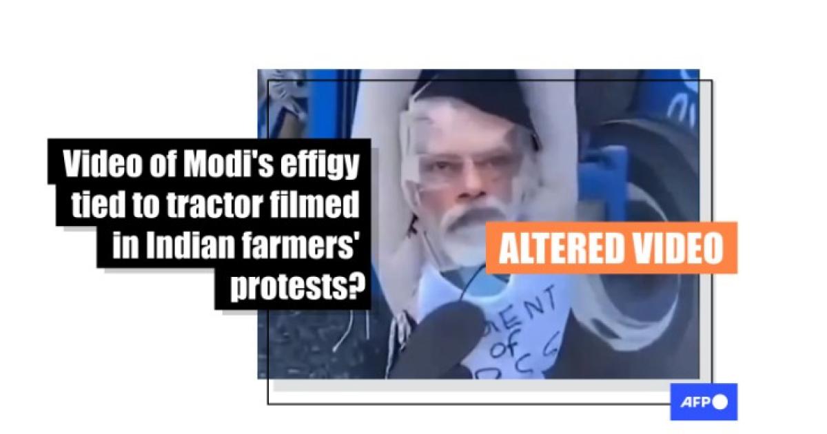The nine-second clip shows an effigy of Modi with footwear hung around its neck and tied to a tractor.