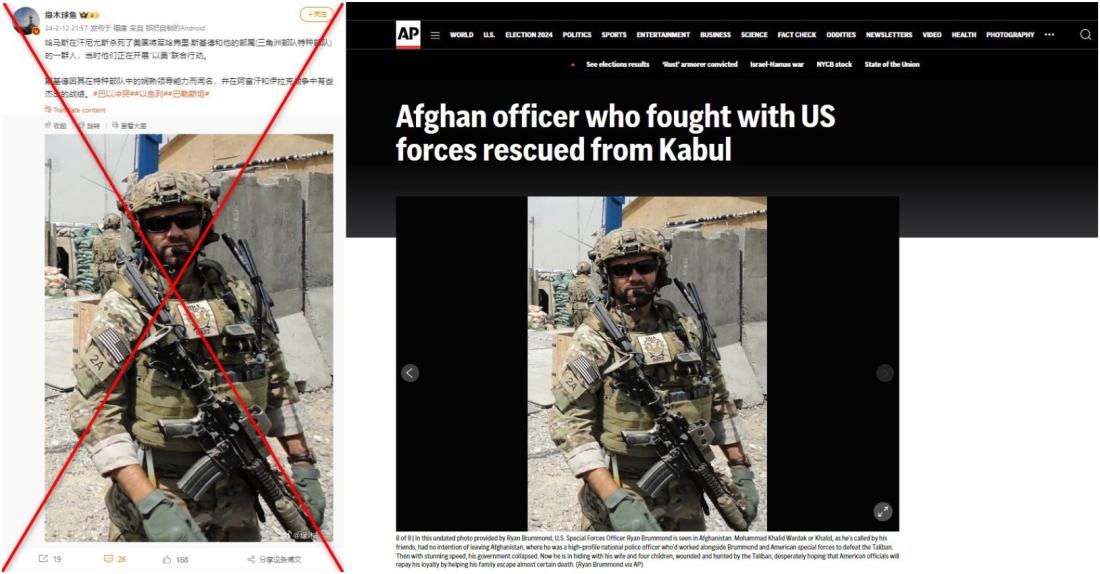 Below is a screenshot comparison of the photo in the false posts (left) and the original AP news report (right):