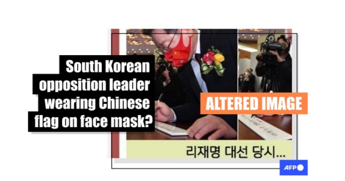 The third image in the report corresponds to the original photo of Lee and Yoon, clearly showing Lee's mask with no Chinese flag.