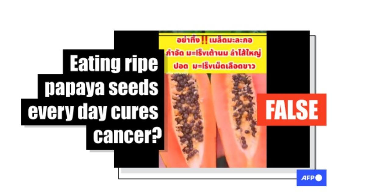 Thai text superimposed on the clip said: "Don't throw away. Papaya seeds cure breast, lung, intestinal cancers and leukaemia." A voice-over could also be heard largely repeating the false claim in Thai.