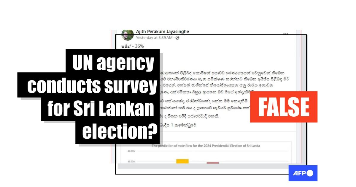 A fabricated survey on Sri Lanka's upcoming presidential election attributed to the UN refugee agency UNHCR surfaced on social media platforms in May 2024. The agency told AFP it did not conducted the poll, while a top official for Sri Lanka's election commission also said it was not genuine.