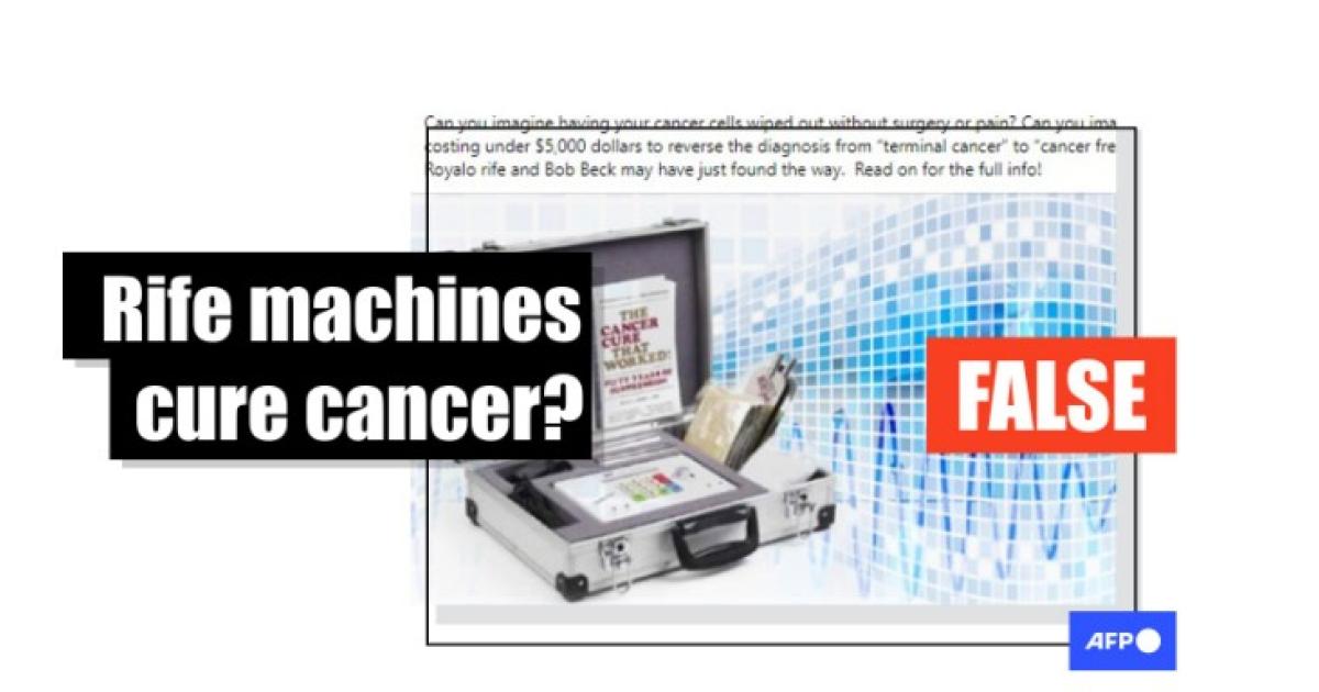 "Rife beam ray machine that can treat cancer but medical mafia shut it down," says text in an image shared May 1, 2024 on Facebook.
