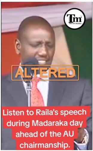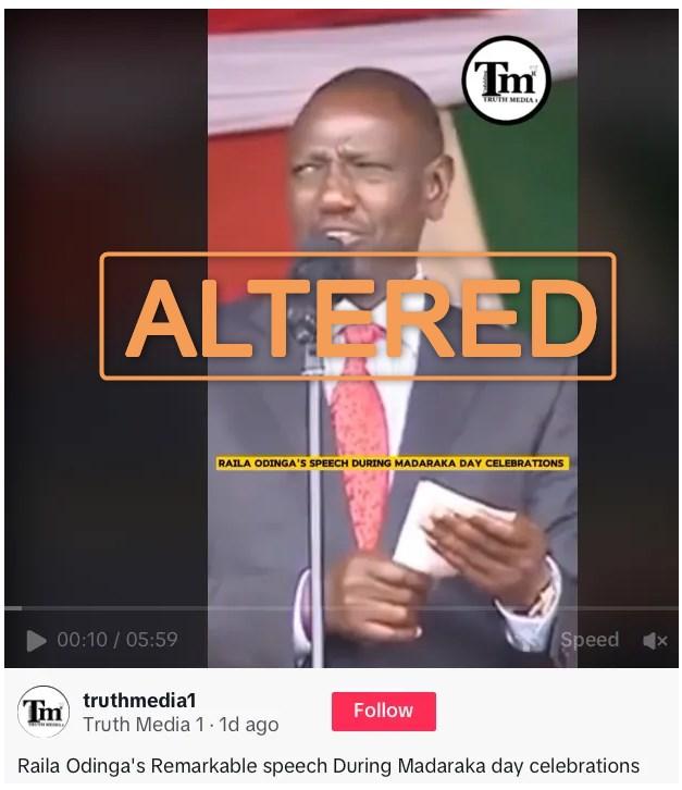 The doctored clip's audio was edited so that Odinga appears to refer to Ruto as “president of the Republic of Kenya”.