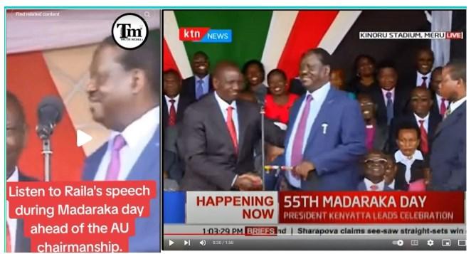 But the video does not show Odinga taking part in the 2024 Madaraka Day celebrations and he does not address Ruto as Kenya's president.