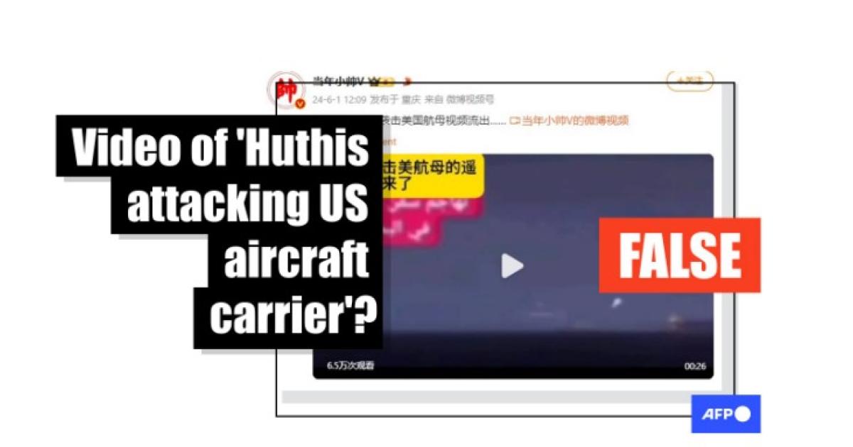 "Video of suspected Huthi attack on US aircraft carrier surfaces," read the simplified Chinese caption of a Weibo post shared on June 1, 2024.