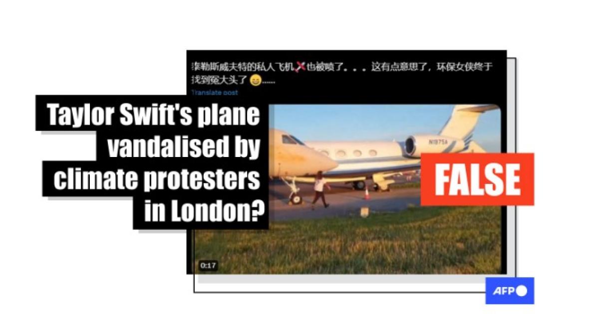 "Taylor Swift's private jet was spray-painted by 'Just Stop Oil' activists," read part of the simplified Chinese caption alongside a video post on X on June 20, 2024.