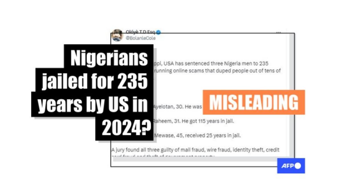 “BREAKING: A court in Mississippi, USA has sentenced three Nigeria men to 235 years in prison for running online scams that duped people out of tens of millions of dollars,” reads a post shared on X on July 14, 2024.