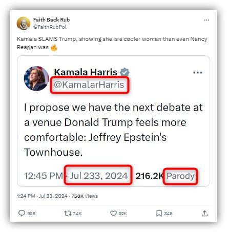 Kamala Harris post suggesting debate at Epstein townhouse is fake