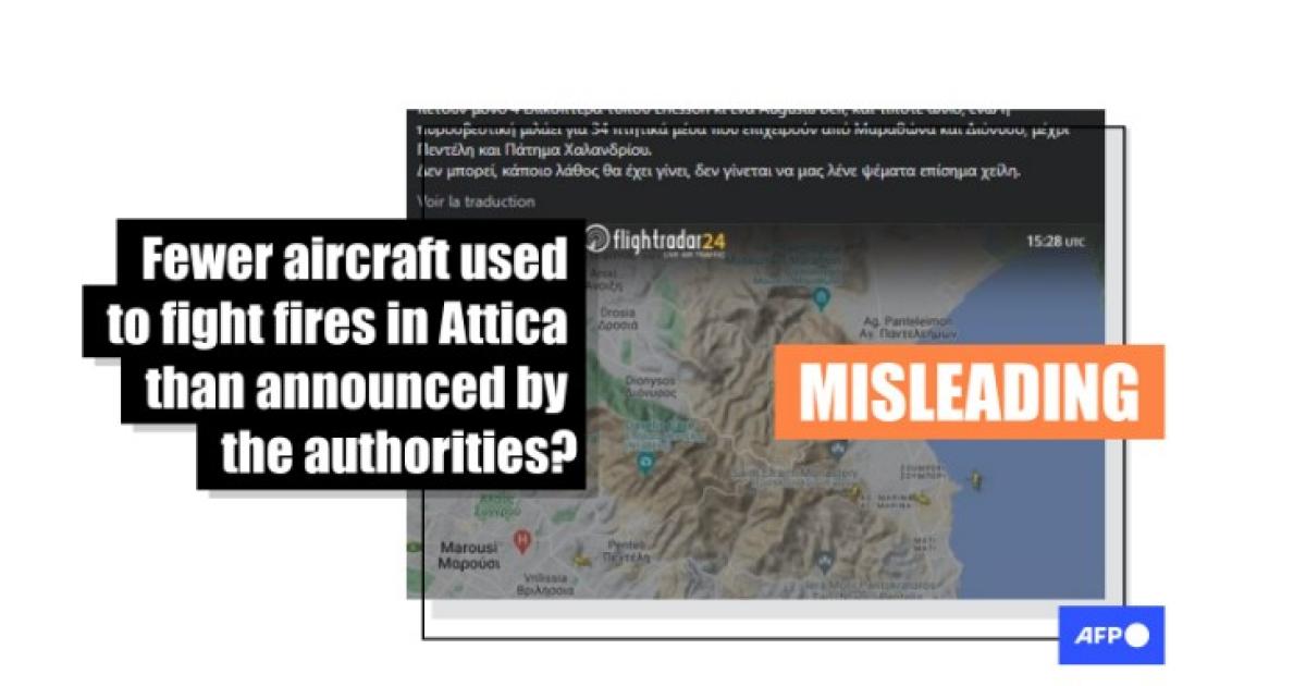 However, these claims are misleading and lack context. The Greek fire department confirmed to AFP that since some of these aircraft were from the Greek Air Force and Greek Military Aviation, they do not show on civilian mapping tools. Furthermore, the department explained that the aircraft used were constantly going back and forth for fuel or water supply. Finally, photographers, videographers and AFP journalists on site observed aircraft carrying out regular water bombardments.