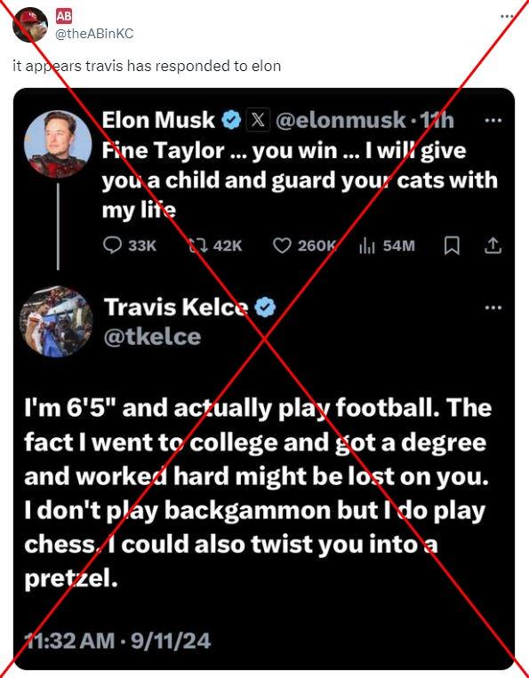 Taylor Swift announced her endorsement of Kamala Harris immediately following the first presidential debate, sparking a rapid response from Elon Musk. Soon after, screenshots circulating on social media claimed to show a confrontational thread on X between the pop star's NFL player boyfriend -- Travis Kelce -- and the billionaire Tesla founder and X owner. But the post does not appear on the tight end's account and his purported comment parrots a sports meme.