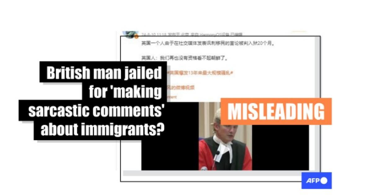 "A UK man has been jailed for 20 months for making sarcastic comments about immigrants on social media," read a post in simplified Chinese shared on Weibo on August 10, 2024.