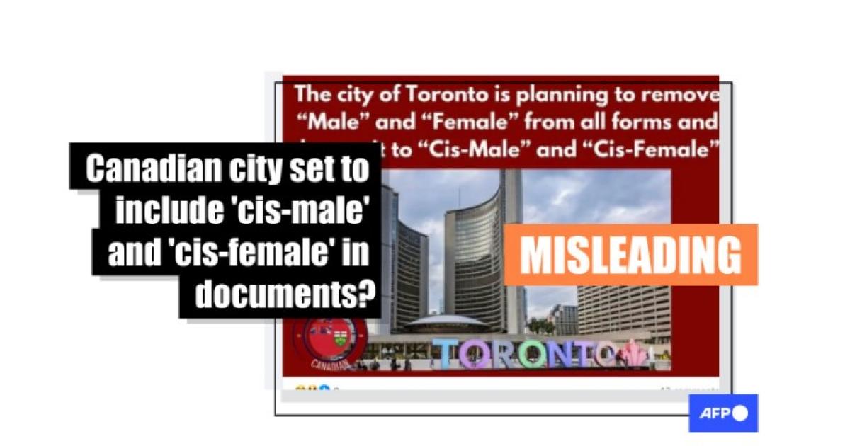 "The city of Toronto is planning to remove 'Male' and 'Female' from all forms and change it to 'Cis-male' and 'Cis-female,'" claims a September 24, 2024 Instagram post from Canadian media company 6ixbuzz, which has previously spread misinformation.