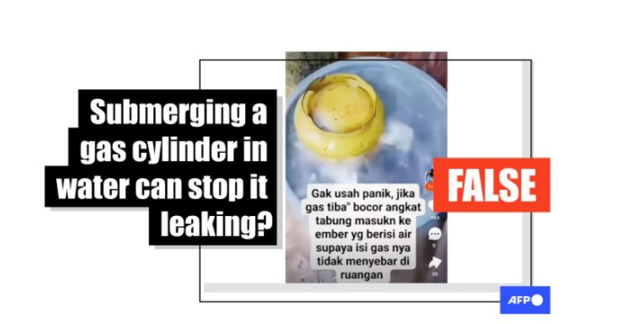 Submerging a leaking gas cylinder in water will have "no effect" on the leak, a spokesperson for Indonesia's state energy firm Pertamina told AFP, contradicting social media posts that claimed this stops the gas from spreading into the air. Pertamina tests their cylinders for leaks by dunking them in water, but this would neither prevent gas from dissipating nor lower the risk of an explosion.
