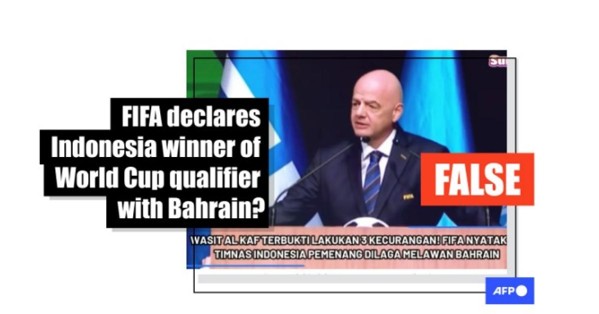 The video -- viewed more than two million times -- shows FIFA president Gianni Infantino speaking at a podium with overlaid Indonesian-language text that reads: "Referee Al-Kaf proven to have committed three counts of fraud! FIFA declares the Indonesian national team the winner against Bahrain."