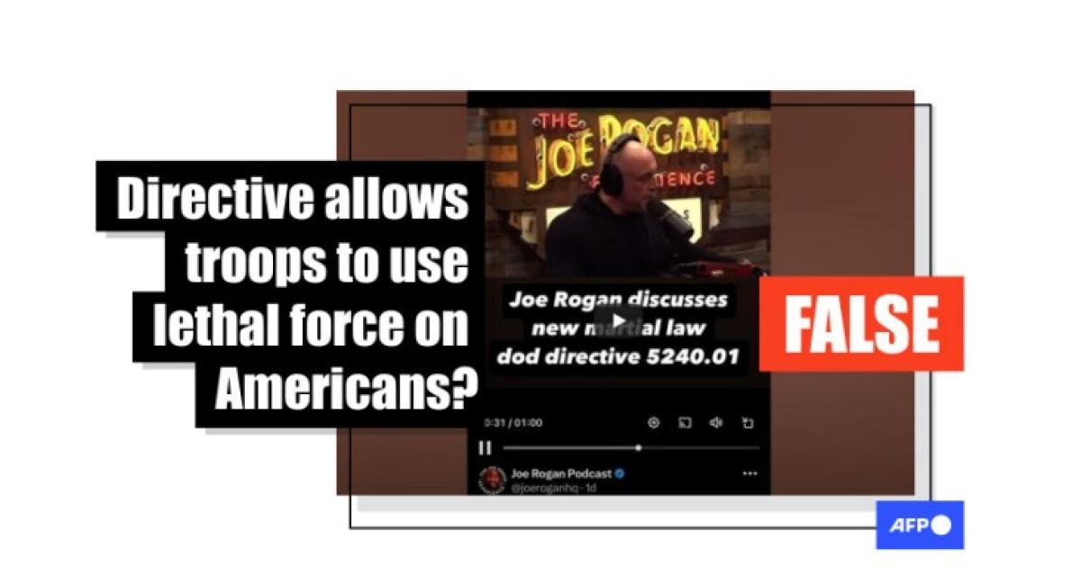 The claim gained momentum two weeks before the US presidential election, after being amplified by Robert F. Kennedy Jr, a former White House candidate who is now backing Republican Donald Trump. The podcast host Joe Rogan also weighed in, saying the directive is "giving the Pentagon power for the first time in history to use lethal force to kill Americans on US soil who protest government policies."