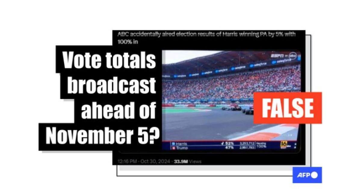 The post shares footage of television station WNEP -- ABC's affiliate for Northern Pennsylvania -- as it broadcast an October 27 Formula One race, with graphics seemingly displaying presidential election results showing Democrat Kamala Harris beating her Republican opponent, Donald Trump, with 52 percent of the vote.